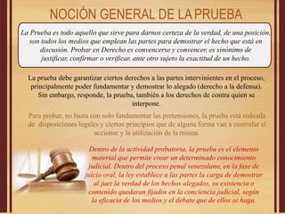 Este documento presenta los principios generales de la prueba en derecho. Explica que la prueba debe garantizar los derechos de las partes involucradas en un proceso, como el derecho a la defensa. Luego define la prueba como todo aquello que sirve para establecer la verdad de un hecho y enumera principios como la publicidad, competencia, inmediación, libertad probatoria, contradicción, carga de la prueba e igualdad probatoria. Finalmente, describe otros principios como el control de la prueba, preclusividad,