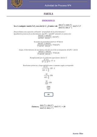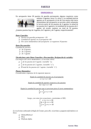 El documento presenta la resolución de dos problemas relacionados con sistemas de ecuaciones lineales (SEL). El primer problema involucra resolver un SEL de 3 ecuaciones y 3 incógnitas relacionado con puestos de guardia en un aeropuerto. El segundo problema determina el valor de k para el cual el SEL asociado no puede resolverse. En ambos casos se utilizan métodos como regla de Cramer y matriz inversa para hallar las soluciones.