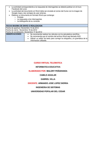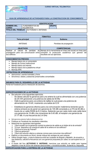 Este documento presenta una guía de aprendizaje para una actividad sobre antenas. La actividad incluye cálculos de ganancia y pérdidas de propagación para antenas, así como respuestas a preguntas relacionadas. Los estudiantes deben publicar sus resultados en Facebook y enviar un documento de Word con la información solicitada antes de las fechas límite indicadas.