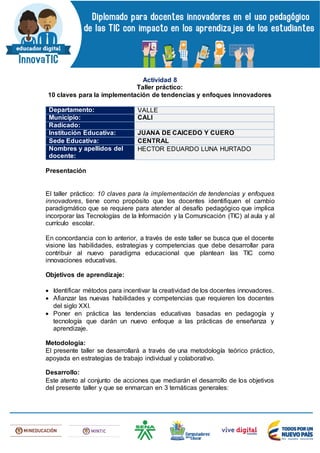 Este documento presenta un taller práctico sobre 10 claves para la implementación de tendencias y enfoques innovadores en la educación. El taller busca que los docentes identifiquen el cambio necesario para incorporar las TIC al aula y currículo. El taller se desarrolla a través de ejercicios prácticos individuales y colaborativos enfocados en nuevas habilidades del siglo 21, políticas de acceso a TIC, y desafíos de la educación moderna.