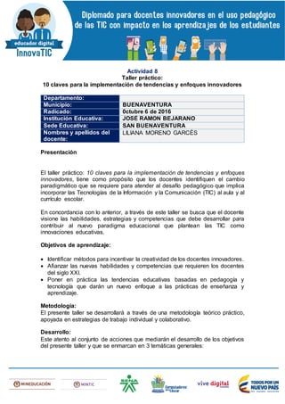 Este documento describe un taller práctico sobre 10 claves para la implementación de tendencias y enfoques innovadores en la enseñanza. El taller tiene como objetivo ayudar a los docentes a identificar el cambio necesario para incorporar las TIC al aula y currículo. Los participantes analizarán tendencias pedagógicas emergentes como el aprendizaje basado en proyectos y aprendizaje vivencial. También examinarán políticas públicas nacionales relacionadas con la innovación educativa y las TIC. Al final, los docentes desarrollarán 10