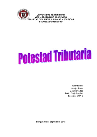 La potestad tributaria del Estado tiene como objetivo recaudar los recursos necesarios para cubrir el gasto público. Esta potestad puede ser originaria o derivada. Existen límites implícitos y explícitos a la potestad tributaria establecidos en la constitución para proteger a los contribuyentes. La competencia tributaria puede ser residual o concurrente, y los ingresos del Estado provienen de impuestos u otras fuentes como empresas públicas.