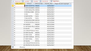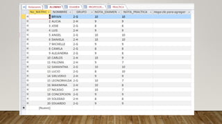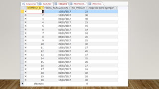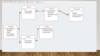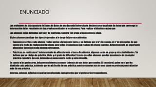 Los profesores de una escuela universitaria deciden crear una base de datos con la información de los resultados de las pruebas de los alumnos. La base de datos almacenará datos de alumnos (número de matrícula, nombre, grupo), exámenes escritos (número, número de preguntas, fecha), prácticas (código, título, dificultad, fecha, nota del alumno), y profesores (identificación, nombre, prácticas diseñadas y fecha de diseño). Las relaciones entre las entidades son complejas ya que
