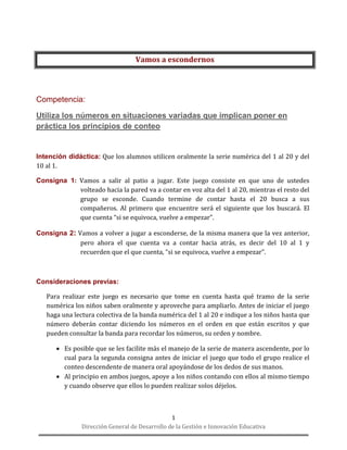 Este documento presenta varias actividades lúdicas para desarrollar habilidades matemáticas en niños de preescolar. Propone juegos como "Vamos a escondernos" y "La Reina pide" para practicar el conteo, y "La Rayuela" para identificar la posición de objetos en una serie ordenada. Además, recomienda libros y materiales didácticos que apoyen conceptos como forma, espacio, medida y resolución de problemas. El objetivo es motivar a los niños en el aprendizaje de las matem
