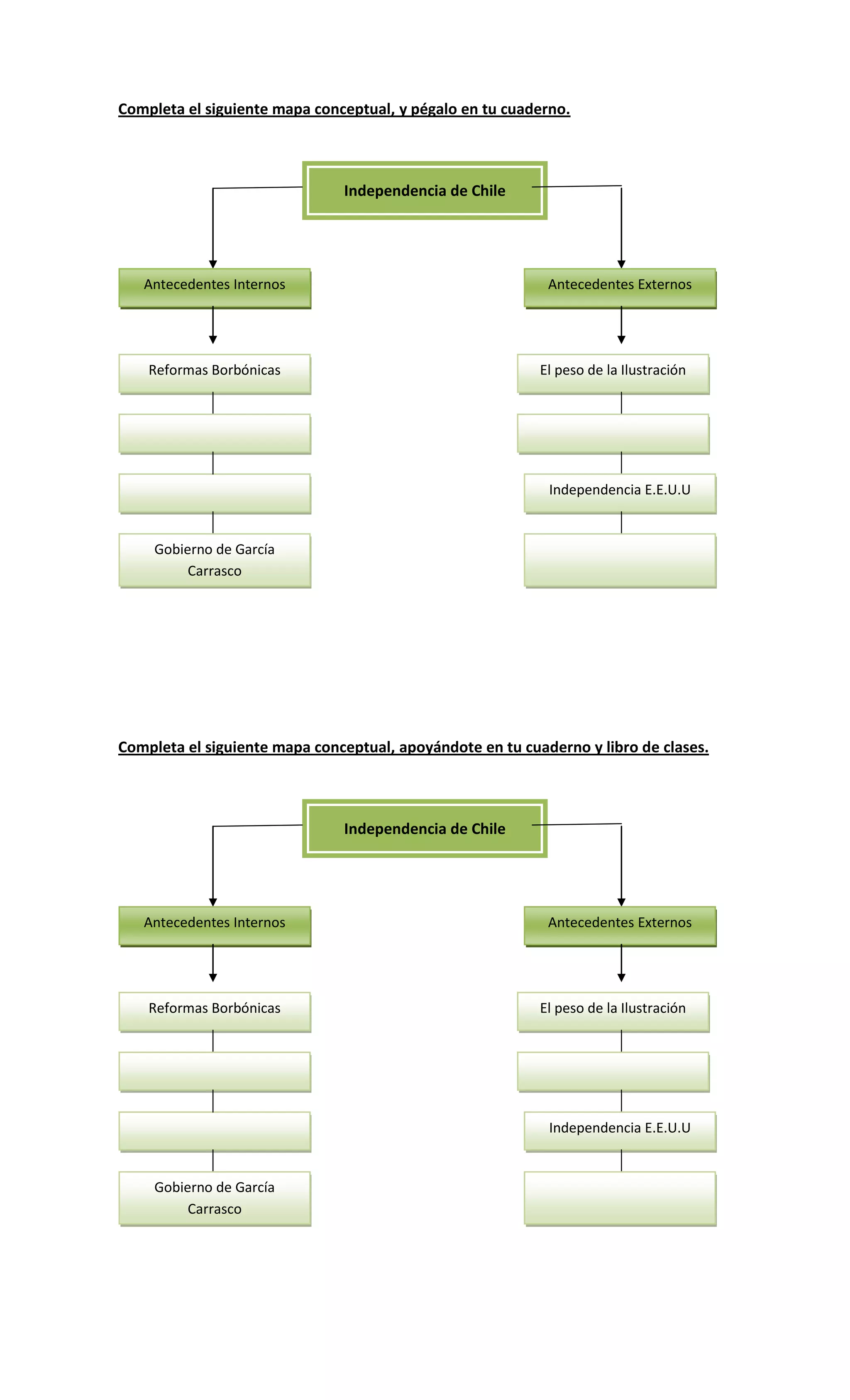 El documento instruye al lector a completar un mapa conceptual sobre los antecedentes internos y externos que llevaron a la independencia de Chile, incluyendo las Reformas Borbónicas, el peso de la Ilustración, la independencia de los Estados Unidos y el gobierno de García Carrasco. El lector debe apoyarse en su cuaderno y libro de clases para completar el mapa conceptual.
