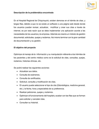 El documento describe la misión y visión de un hospital, que incluyen prestar servicios de salud de calidad con enfoque en los derechos de los pacientes y formación del personal. También detalla demoras en el proceso de citas del Hospital Regional de Chiquinquirá debido a la falta de un sistema en línea. El objetivo del proyecto es optimizar la gestión de información de pacientes a través de la implementación de una aplicación web que permita solicitar, modificar y consultar citas de manera remota.
