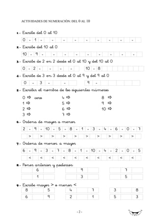 Este documento presenta una serie de actividades de numeración para practicar desde el 0 hasta el 99. Incluye ejercicios como escribir números de forma ascendente y descendente, poner el nombre de los números, descomponer en decenas y unidades, ordenar de mayor a menor, y más. Las actividades se presentan en bloques de 10 números y van aumentando progresivamente la decena hasta llegar a 99. El objetivo es que los estudiantes practiquen diariamente 2-3 ejercicios hasta dominar completamente la numeración.