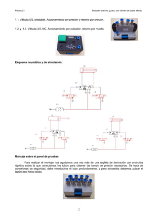 Este documento describe una práctica sobre un pulsador de avance y retroceso para controlar un cilindro de doble efecto neumático. El objetivo es familiarizarse con los componentes neumáticos como válvulas y cilindros. El circuito usa una válvula biestable 5/2 accionada por dos pulsadores para controlar el movimiento del cilindro. Al pulsar el primer pulsador, el vástago del cilindro sale y permanece fuera; al pulsar el segundo pulsador, el vástago vuelve a entrar y