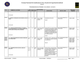 El documento presenta la programación de actividades de capacitación judicial que tendrán lugar del 30 de septiembre al 5 de octubre de 2013 en la Escuela de Capacitación Judicial. Incluye información sobre las fechas, nombres, áreas temáticas, capacitadores, destinatarios, sedes, horarios y tipos de diferentes cursos, talleres y reuniones.