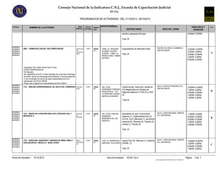 El documento presenta la programación de actividades de capacitación judicial del Consejo Nacional de la Judicatura entre el 21 de octubre y el 26 de octubre de 2013. Incluye información sobre 15 cursos/diplomados sobre diversas áreas temáticas como derecho constitucional, derechos humanos, derecho penal, derecho privado, técnicas de oralidad y derechos de la niñez. Los cursos se llevarán a cabo de forma presencial en diferentes sedes y estarán a cargo de capacitadores del Consejo Nacional de la Judicatura