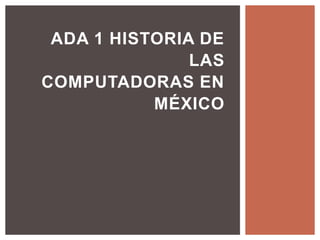 La historia de las computadoras en México comenzó en 1958 cuando la UNAM puso en operación la IBM-6501. En 1982, la UNAM diseñó la computadora AHR para ejecutar programas en LISP de manera eficiente, y en 1984 se desarrolló la computadora personal Turing-850 con características innovadoras como un procesador Z-80 y lápiz óptico. Más adelante, programas como E-México buscaron reducir la brecha digital y compañías como Intel continuaron desarrollando nuevas tecnologías.