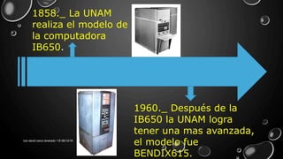El documento describe brevemente los hitos del desarrollo de la computación en México y el mundo entre 1858 y 2003, incluyendo la creación del primer modelo de computadora en la UNAM en 1858, la adquisición de sistemas más avanzados en las décadas posteriores, la conexión de México a la red satelital Intelsat en 1966, y el desarrollo e introducción de nuevas tecnologías como discos duros, computadoras personales y sistemas operativos por parte de compañías como IBM, Apple, Microsoft e Intel a lo largo de las