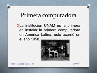El documento resume los hitos más importantes en el desarrollo de las tecnologías de la información y comunicación (TIC) en México, incluyendo la instalación de la primera computadora en la UNAM en 1958, la creación de la primera televisora Televisa en 1972, y el establecimiento del primer servicio de telefonía celular Telcel en 1984.