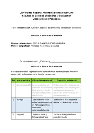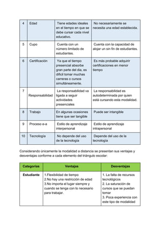 Este documento compara la educación presencial y a distancia en 10 criterios comunes como la comunicación, el tiempo, el espacio y la edad. Luego analiza las ventajas y desventajas de la educación a distancia para los estudiantes, profesores y gestión educativa desde el triángulo escolar. Finalmente incluye 3 referencias sobre educación a distancia y estilos de aprendizaje.