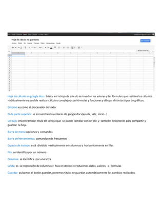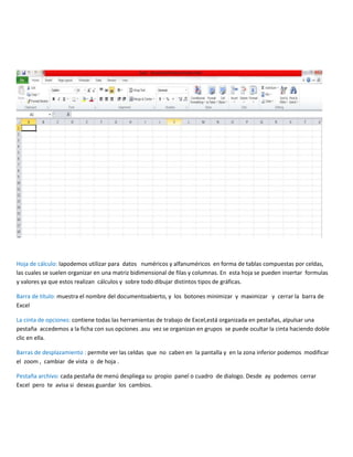 Una hoja de cálculo permite organizar datos numéricos y de texto en celdas dentro de una matriz de filas y columnas, e insertar fórmulas y gráficas. En Excel, la cinta de opciones contiene las herramientas de trabajo organizadas en pestañas y grupos, mientras que las barras de desplazamiento permiten navegar por celdas que no caben en la pantalla. De manera similar, una