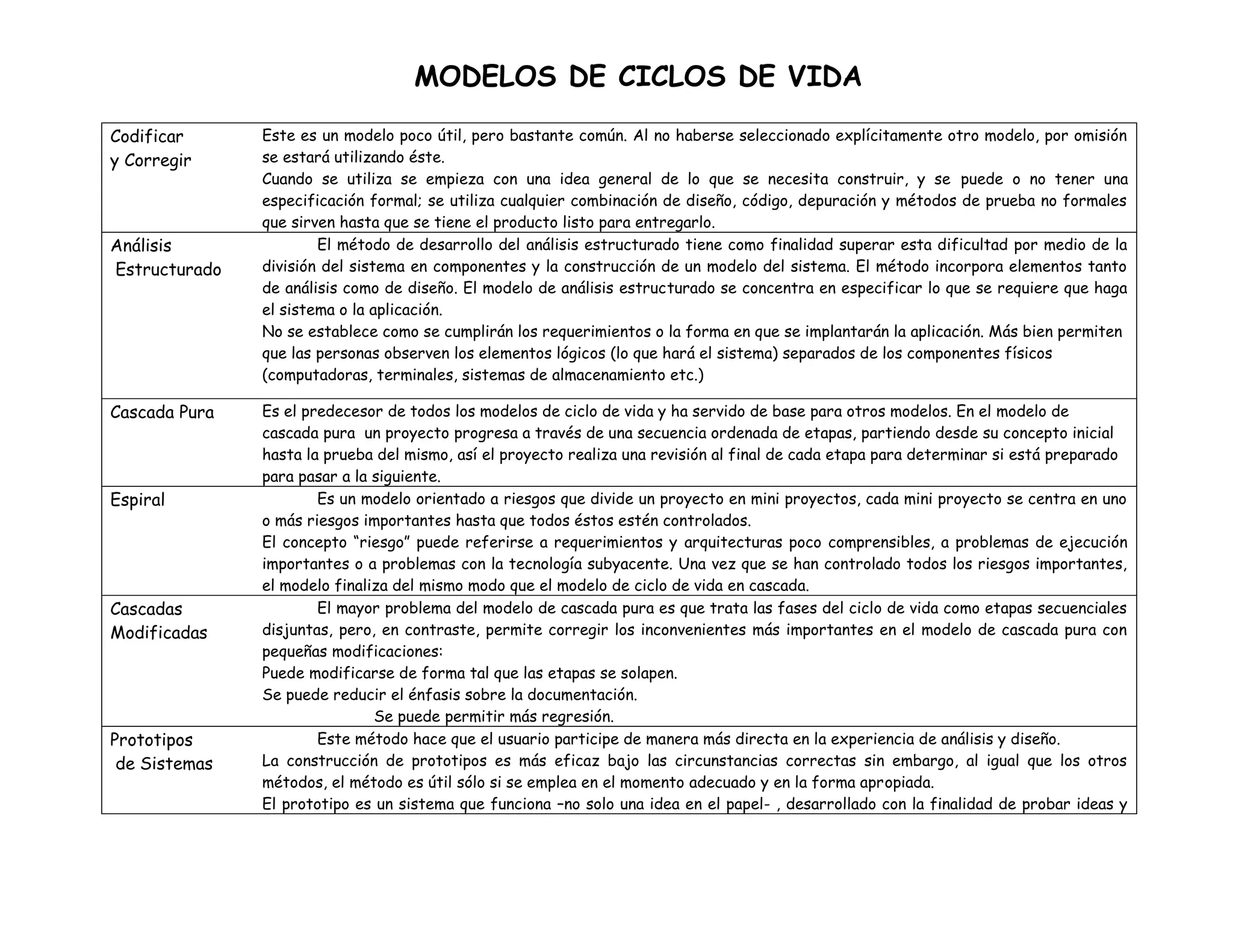 Este documento describe varios modelos de ciclo de vida para el desarrollo de software, incluyendo el modelo en cascada puro, el modelo en espiral, los prototipos de sistemas, el prototipado evolutivo y el ciclo en V. Cada modelo sigue un enfoque diferente como dividir el proyecto en etapas secuenciales (modelo en cascada), enfocarse en los riesgos (modelo en espiral), construir prototipos (prototipado), realizar pruebas iterativas (ciclo en V) o entregar el