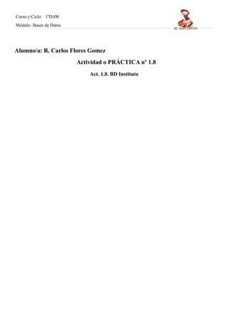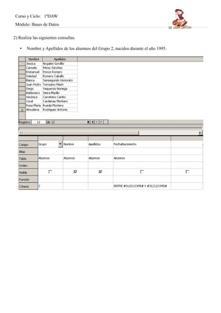 El documento describe una práctica de bases de datos que incluye realizar consultas a una base de datos de un instituto y generar informes y formularios. Se piden siete consultas diferentes sobre alumnos, profesores, equipos deportivos y actividades. También se solicita crear dos formularios sobre tablas seleccionadas y dos informes, uno sobre una tabla y otro sobre una consulta.