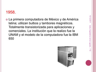 El documento resume la evolución de las computadoras en México desde 1958 hasta 1984. Algunos hitos clave incluyen: la primera computadora de México en 1958 en la UNAM; la creación del Centro Nacional de Cálculo en el IPN en 1961; y la introducción de la primera computadora personal IBM PC en 1981. El documento también describe el desarrollo de nuevas tecnologías como los circuitos integrados, microprocesadores y dispositivos de almacenamiento.