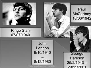 The Beatles se formó en 1960 en Liverpool como una de las bandas más exitosas. Estaba compuesta por John Lennon, Paul McCartney, George Harrison y Ringo Starr. Aunque tuvieron gran éxito con su primer sencillo "Love Me Do" y ganaron varios premios Grammy, se separaron en 1970 luego de que Paul McCartney anunciara su salida. A pesar de carreras solistas exitosas, John Lennon fue asesinado en 1980 y George Harrison murió de cáncer en 2001, mientras que Paul McCartney y Ringo Starr continúan
