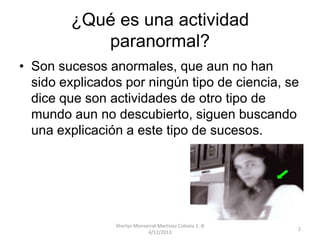 Este documento describe varios sucesos paranormales, incluyendo la casa embrujada de Amityville donde una familia fue asesinada, extraños sonidos de búhos y desapariciones de niños en Nashville, mensajes amenazantes enviados al celular enterrado de una niña fallecida, un proyecto sobre una bruja que engañaba a niños para sacarles sangre, y el caso verídico de un niño poseído que sufrió varios exorcismos.