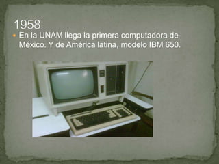 Este documento resume hitos importantes en el desarrollo de la computación, incluyendo la llegada de la primera computadora a México y Latinoamérica (IBM 650), el lanzamiento de los primeros microprocesadores por Motorola y Intel, la introducción de las primeras computadoras personales por HP, el establecimiento del primer modo de internet en México, y el desarrollo continuo de procesadores y sistemas más avanzados por parte de empresas como IBM, Intel y otros.