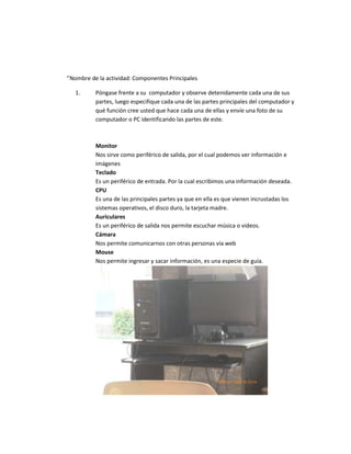 Este documento presenta una introducción a los componentes principales de una computadora. Explica cada una de las partes de una computadora e identifica el monitor, teclado, CPU, auriculares, cámara y mouse. También discute las limitaciones de las computadoras de mano y PDAs, e investiga los últimos procesadores, memorias RAM más rápidas y las especificaciones de la tarjeta de video del computador del autor.