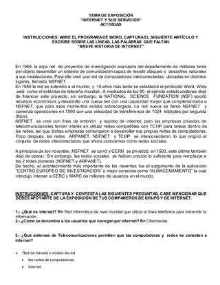 La red ARPANET se creó en 1969 con el objetivo de desarrollar un sistema de comunicación robusto. En 1980 la red se extendió a nivel mundial y en 1990 se estableció el protocolo HTTP y la World Wide Web. A principios de los 90s las redes pioneras NSFNET y ARPANET fueron reemplazadas por las redes sociales que habían crecido lo suficiente. El CERN introdujo la World Wide Web al público en 1993.