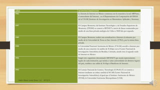 El documento presenta una línea de tiempo que resume la historia del desarrollo de Internet en México desde 1982 hasta 2014. Comenzó con la conexión de la UNAM a ARPAnet en 1982 y la conexión del Tec de Monterrey a BITNET en 1987. En los años 90 otras universidades e instituciones se conectaron vía satélite. En 1994 se abrió Internet comercialmente en México. En 1995 se creó NIC-México para administrar los recursos de Internet en el país. Para 2014, Internet era ampliamente utilizado por instituciones, empresas y personas para