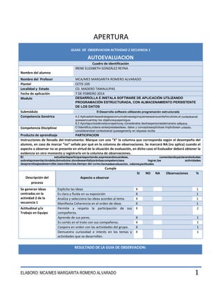 Este documento presenta una guía de observación para evaluar la participación de una estudiante llamada Irene Elizabeth González Reyna en una actividad de desarrollo de software. La guía incluye un cuadro para identificar a la estudiante, el profesor, la escuela, fecha y módulo. Luego enumera aspectos a observar como generar ideas, expresarse claramente, analizar ideas y mostrar coherencia y actitud como permitir participación de compañeros, aprender de ellos, ser cortés y cooperar. Al final se muestra el resultado total de 10 puntos.