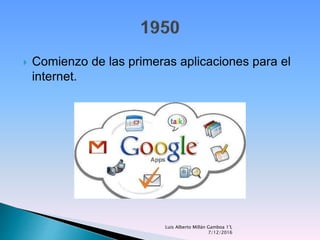 El documento resume los principales hitos en el desarrollo de Internet, incluyendo el lanzamiento de ARPANET, la creación de NFS, la World Wide Web, el primer navegador Mosaic, la apertura comercial de la web en México, la consolidación de servicios de Internet, la entrada de Microsoft a Internet y Internet Explorer convirtiéndose en el navegador más usado, y el crecimiento a más de 70 millones de usuarios de Internet en un país.