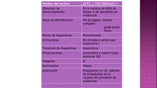 Este documento proporciona instrucciones para crear una presentación en PowerPoint sobre la Estación Espacial Internacional. Incluye detalles sobre el nombre del archivo, ubicación de almacenamiento, formato de diapositivas, animaciones, transiciones, presentación y publicación de la presentación. También incluye un breve resumen sobre la participación de Europa en la Estación Espacial Internacional a través del desarrollo conjunto, operación y uso de la estación.