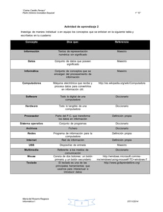 El documento describe brevemente la historia de la computadora desde la invención del ábaco en el año 3500 a.C. hasta el desarrollo de sistemas operativos como UNIX en 1975. También incluye tablas que definen conceptos clave de informática como datos, información, hardware, software y periféricos comunes como teclados y mouse. Finalmente, menciona ejemplos de diferentes tipos de software como sistemas operativos, software de productividad y multimedia.