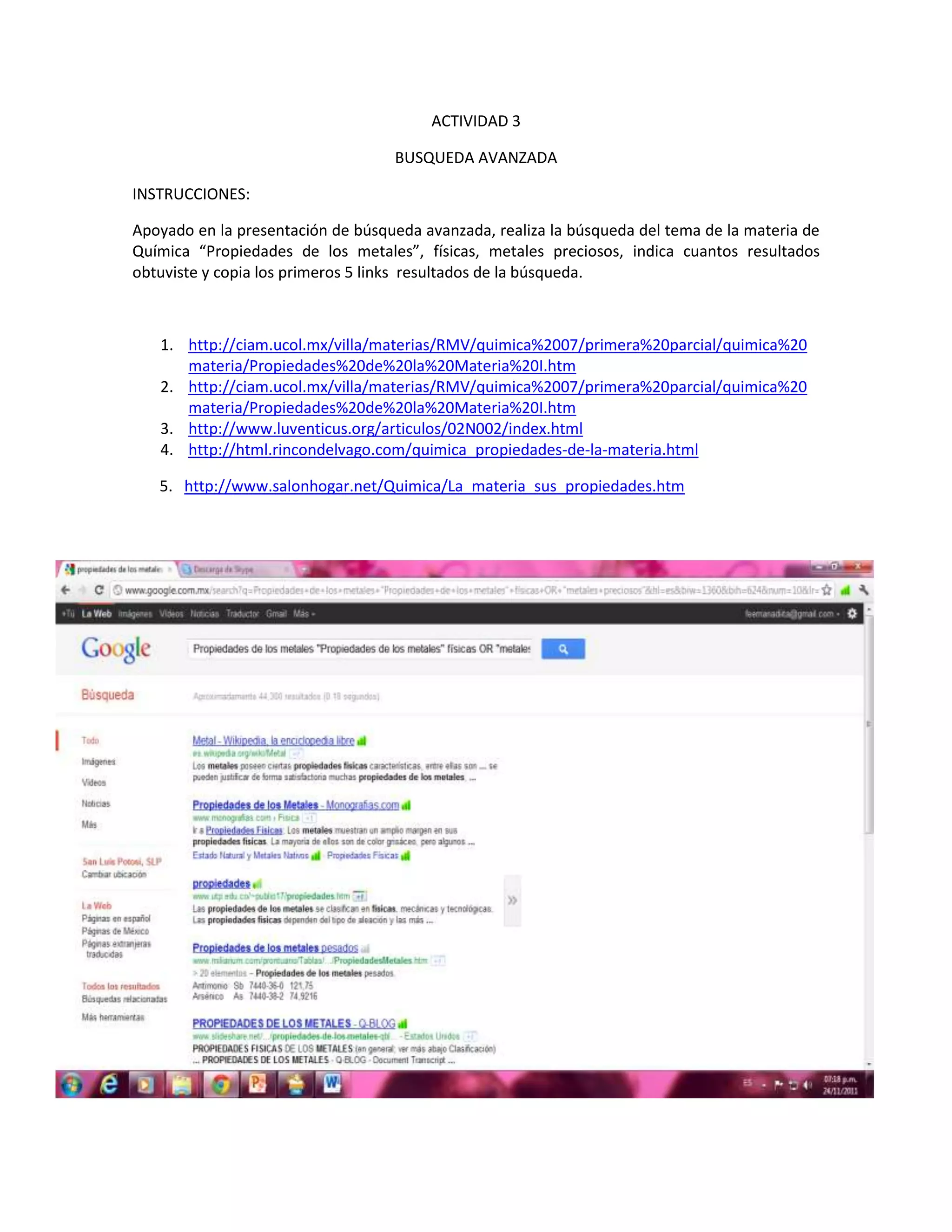 El documento instruye realizar una búsqueda avanzada sobre las propiedades físicas de los metales y metales preciosos en Química. Se obtuvo una cantidad indeterminada de resultados y se copiaron los primeros 5 links, que apuntan a páginas web sobre propiedades de la materia y química.