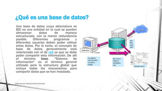Este documento proporciona información sobre varias bases de datos existentes, incluyendo SQL, NoSQL, Oracle, MongoDB, Cassandra y más. Explica las características y ventajas de cada una, como que SQL es una base de datos relacional, MongoDB almacena datos en formato JSON, y Cassandra es una base de datos orientada a columnas que es tolerante a fallos.