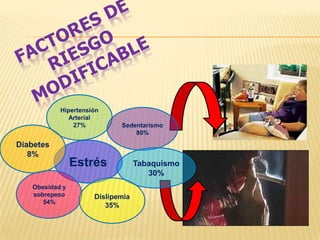 El documento habla sobre las enfermedades cardiovasculares y sus principales factores de riesgo como la hipertensión arterial, diabetes, obesidad, tabaquismo y estrés. Indica que las enfermedades cardiovasculares causan el 29% de las muertes a nivel mundial y el 23% de las muertes en América Latina y el Caribe de personas menores de 60 años. Recomienda practicar deportes, comer de manera saludable, realizarse controles médicos periódicos y evitar hábitos nocivos para prevenir estas enfer