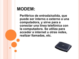 El documento describe los principales componentes de hardware de una computadora, incluyendo el modem, disco duro, placa madre, escáner, monitor, memorias, periféricos de almacenamiento, gabinete, teclado, mouse, disqueteras, puertos, tarjeta de sonido, microprocesador. Cada componente se define brevemente y se incluyen enlaces a fuentes bibliográficas.