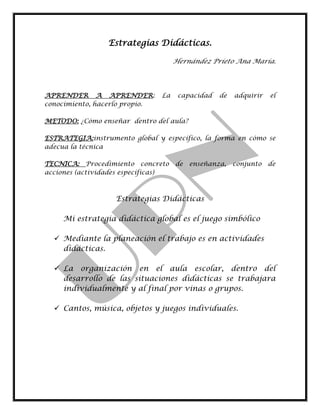El documento habla sobre estrategias didácticas para enseñar en el aula. Explica que una estrategia didáctica global es el juego simbólico y que las técnicas concretas de enseñanza incluyen actividades planeadas, trabajo individual y en grupos pequeños utilizando canciones, música, objetos y juegos individuales.