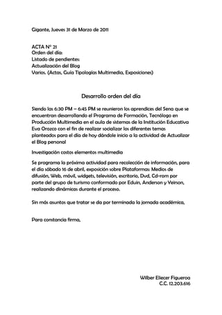 La reunión de los aprendices del Sena se llevó a cabo el 31 de marzo de 2011 para discutir varios temas pendientes como actualizar el blog, las actas, y una guía sobre tipologías multimedia. También se programó una actividad para el 16 de abril donde un grupo expondrá sobre diferentes plataformas de difusión como la web, dispositivos móviles y televisión. La reunión concluyó después de tratar los asuntos en la agenda.