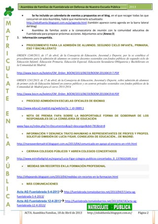La asamblea de familias de Fuenlabrada discute varios temas relacionados con la educación pública, incluyendo la oferta de un aula privada, la prueba de 5 años, y planes para realizar encierros en las escuelas el 25 de abril para defender la educación pública. También comparten información sobre nuevas órdenes relacionadas con la admisión de estudiantes y acuerdan difundir una campaña para matricularse en escuelas públicas.