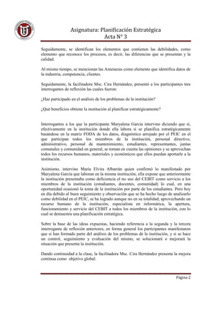 Este documento presenta el acta de la tercera sesión de un curso de planificación estratégica. La sesión incluyó discusiones sobre la matriz FODA y sus elementos, así como una actividad práctica donde los participantes analizaron problemas identificados en sus instituciones. Los grupos tuvieron dificultades delimitando claramente los problemas. La facilitadora enfatizó la importancia del trabajo en equipo, comunicación y retroalimentación para mejorar el análisis de situaciones.