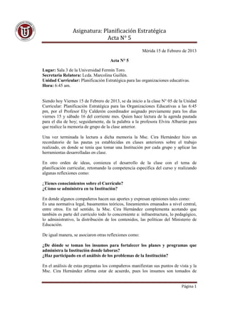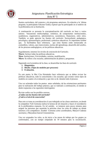 Este documento presenta un acta de la clase N° 5 de la asignatura Planificación Estratégica. La clase cubrió temas relacionados con la planificación curricular, incluyendo definiciones de currículo, fuentes de currículo, y niveles de concreción de currículo. Los estudiantes participaron en discusiones y trabajos en grupos sobre estos temas. La clase concluyó con preguntas y respuestas sobre lo que los estudiantes aprendieron.