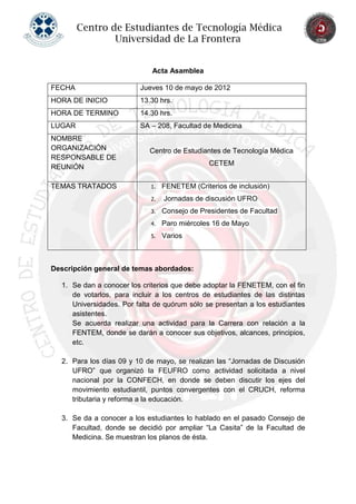 El acta resume una asamblea del Centro de Estudiantes de Tecnología Médica de la Universidad de La Frontera. Se discutieron cinco temas: 1) los criterios de inclusión de la FENETEM, 2) las jornadas de discusión de la UFRO, 3) las mejoras al edificio de la Facultad de Medicina, 4) el paro del 16 de mayo, y 5) las próximas charlas del CETEM. Debido a la falta de quórum, no se votaron los criterios de la FENETEM ni el