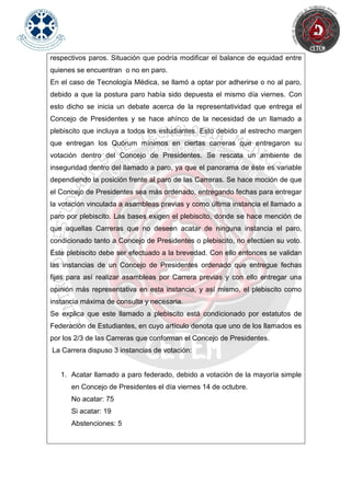El documento resume las discusiones de una asamblea de la Carrera de Tecnología Médica sobre adherirse o no a paros federados. La carrera votó no adherirse a un paro llamado por el Concejo de Presidentes ni a paros de la CONFECh. Sin embargo, estarían dispuestos a acatar un paro federado si este es llamado a través de un proceso ordenado del Concejo o mediante un plebiscito universitario. La carrera concluyó no adherirse a los paros actuales pero estar abiertos a hacerlo