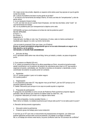 Este resumen describe las actas de la 43a Asamblea de Podemos Paris del 10 de noviembre de 2016. La asamblea trató varios temas: 1) crear un grupo de trabajo para gestionar las redes sociales y comunicación, 2) discutir la organización de un foro exterior en Madrid, y 3) revisar y actualizar el documento organizativo del círculo. También se presentaron y aprobaron las cuentas de un evento reciente.
