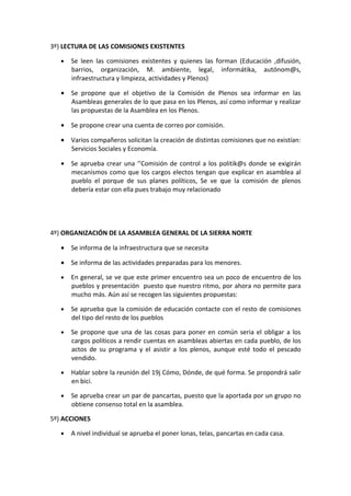 La asamblea popular de Manzanares del Real del 3 de junio de 2011 trató varios temas: 1) se comunicaron los puntos del consenso del movimiento 15M, 2) se organizó la comisión de informática, 3) se leyeron y propusieron nuevas comisiones, 4) se organizó la asamblea general de la Sierra Norte del 4 de junio, 5) se propusieron acciones y 6) se recogieron ruegos y preguntas. La próxima asamblea sería el 9 de junio.