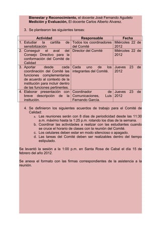 El director de la institución educativa convocó una reunión para conformar un Comité de Calidad como parte de un nuevo proceso de mejora continua de 3 años. En la reunión se eligieron los coordinadores para cada rol del Comité y se asignaron tareas iniciales como estudiar una cartilla y obtener el aval del Consejo Directivo. El Comité acordó reunirse cada 8 días y estableció algunas normas como silenciar los celulares durante las reuniones.