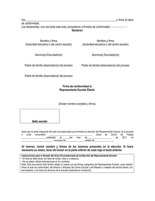 Este documento detalla el proceso de elección de un Representante Escolar en una escuela. Se llevó a cabo la votación entre varios alumnos que expusieron temas relacionados con valores. Los votos fueron contados por dos alumnos escrutadores. Como resultado de la votación, el alumno [nombre] fue electo Representante Escolar de la escuela. El acta incluye detalles sobre la fecha de la elección, las autoridades presentes, los alumnos participantes y el proceso de votación y escrutinio.