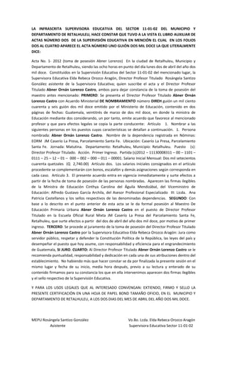 El acta documenta la toma de posesión de Abner Lorenzo como Director Profesor Titulado en la Escuela Oficial Rural Mixta JM Caserío La Presa en Retalhuleu. Se presenta el nombramiento ministerial de Lorenzo y se le da posesión formal del cargo. Lorenzo jura cumplir con sus responsabilidades como servidor público de manera responsable y eficiente. Se le recomienda puntualidad y dedicación en sus funciones.