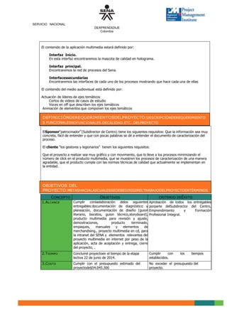 Este documento presenta el proyecto "Multimedia Inducción al SIGC" que busca crear una aplicación multimedia e interactiva y medios audiovisuales para mostrar información sobre el Sistema Integrado de Gestión de Calidad del SENA. El proyecto será desarrollado por aprendices del SENA y contará con herramientas tecnológicas de última generación. El objetivo es permitir a funcionarios y aprendices interactuar con la aplicación para conocer los procesos del SIGC de una manera didáctica y entretenida. El proyecto