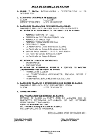 Este documento es un acta de entrega de cargo del puesto de Jefe de Almacén en Desaguadero, Puno el 31 de octubre de 2014. Detalla los datos del trabajador que entrega el cargo, Duaner David Peña Jihuaillanca, y los documentos, útiles de oficina y mobiliario a su cargo. También incluye los datos del nuevo jefe de almacén, Ritcher Paricahua Huaco, y las observaciones de cada uno sobre la entrega del cargo.